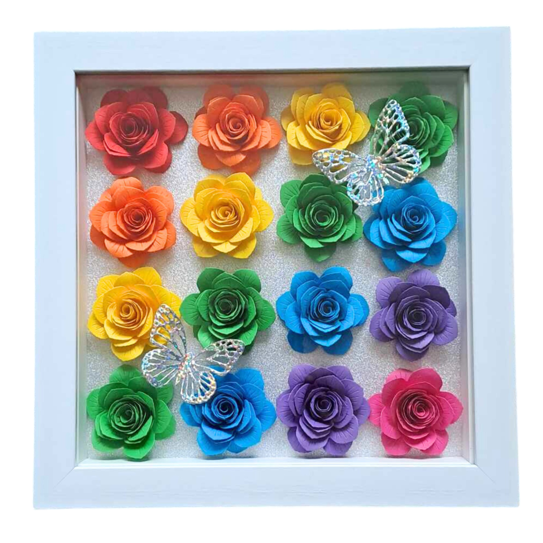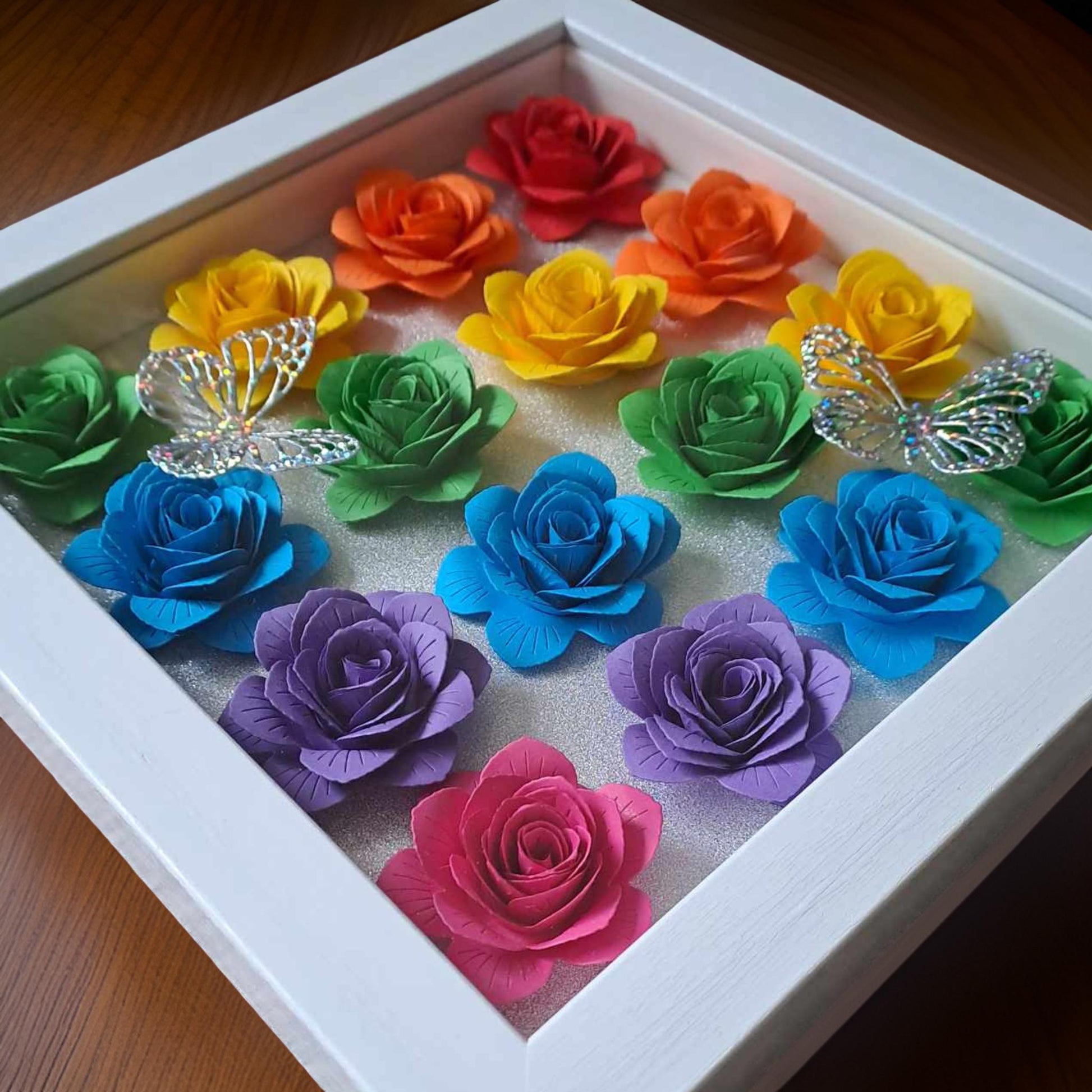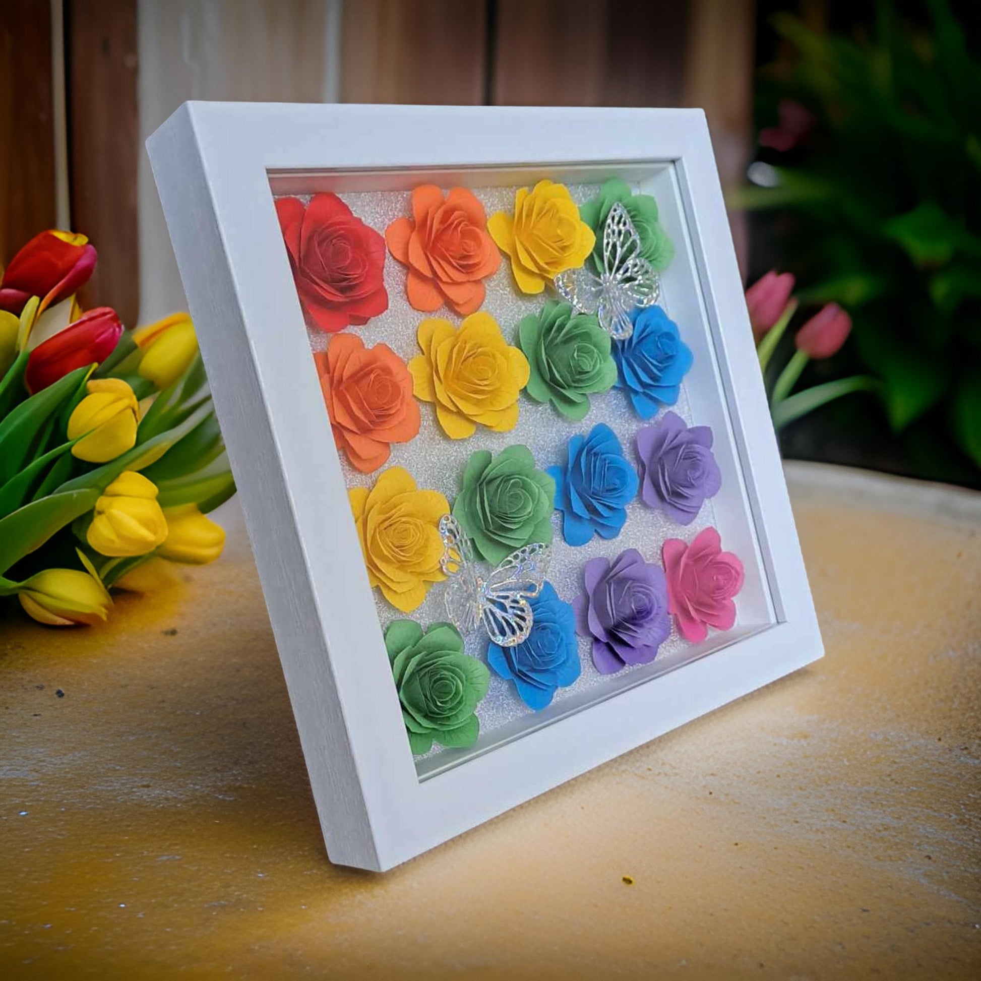 This lovely bright coloured rainbow flower shadow box would make a beautiful and unique handmade gift for someone special. Handcrafted with love and care from paper flowers will last lifetime.