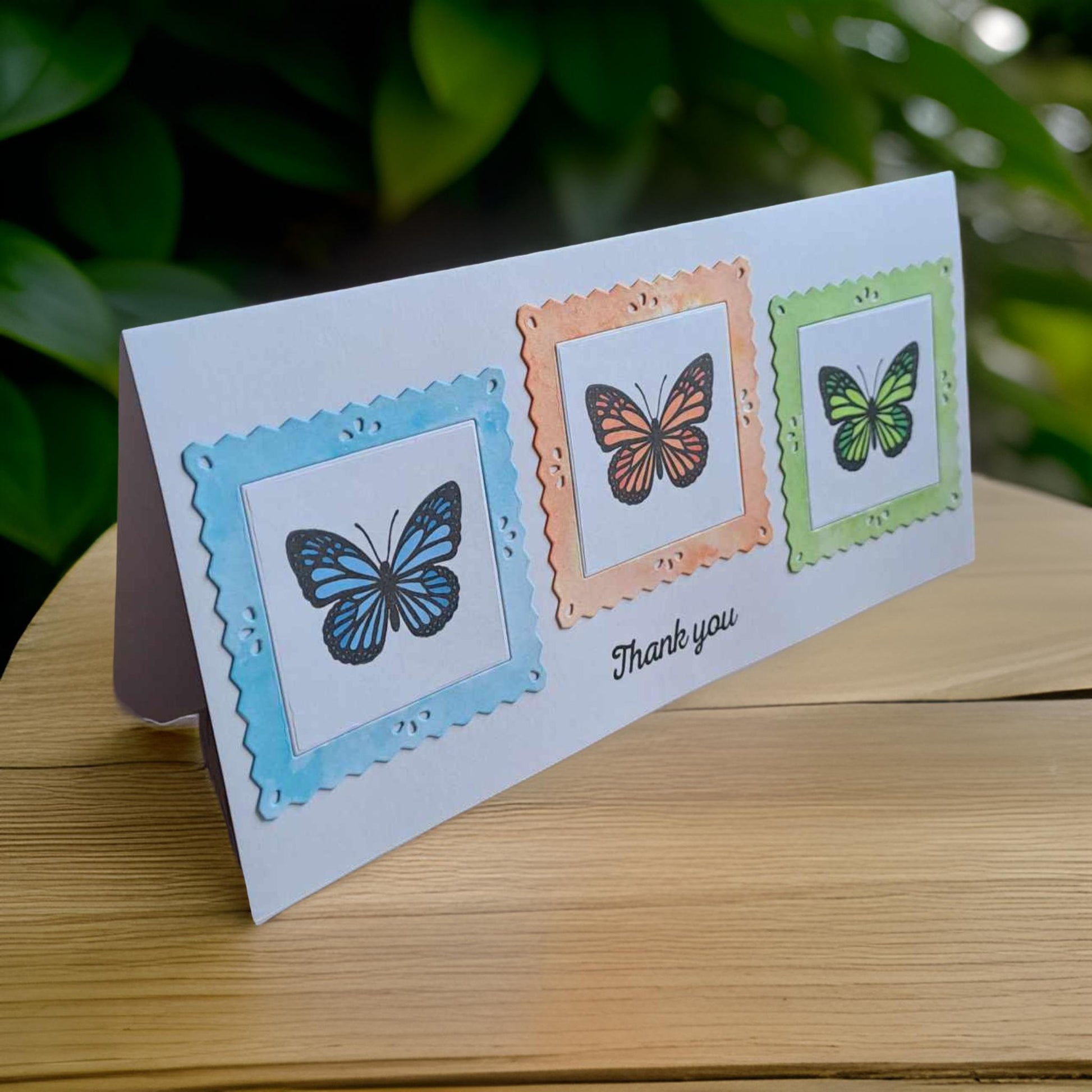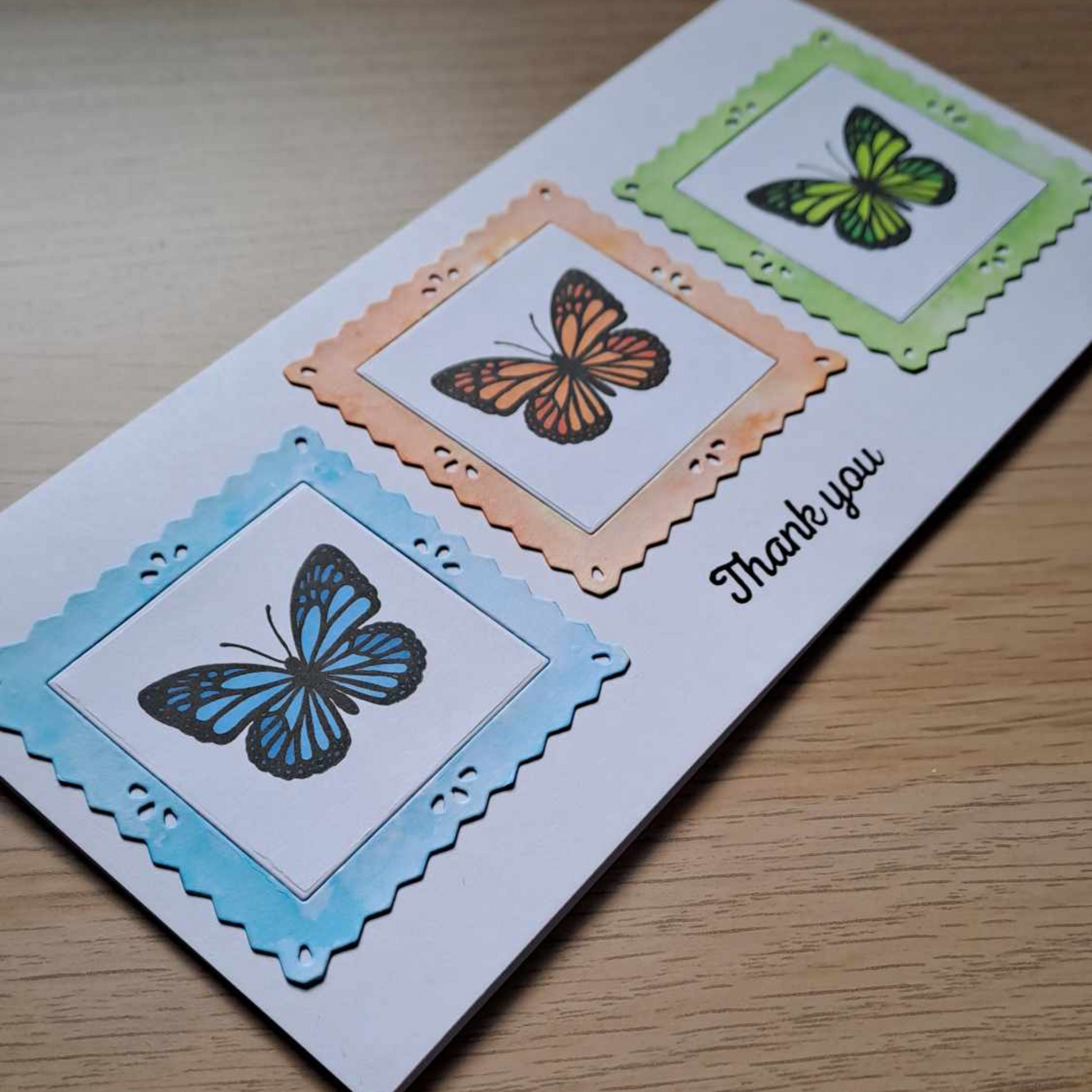 This simple card has 3 framed butterflies in blue, orange and green. Also a simple sentiment of Thank You.