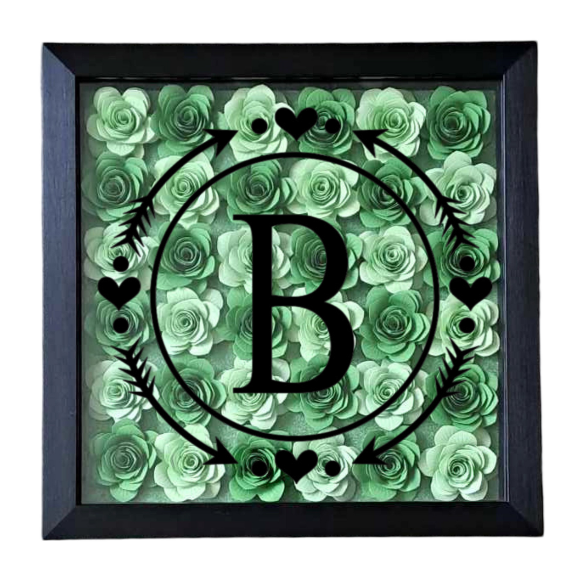 It is also personalised with a Heart & Arrow Circle design and an initial in the centre. Made with individually die cut and hand rolled flowers in two colours so every frame is unique.