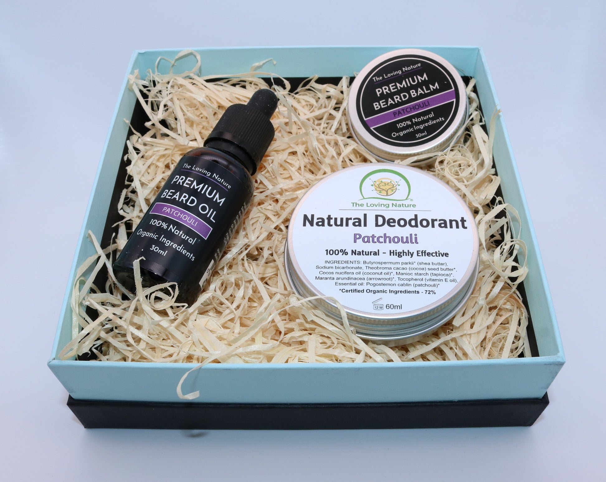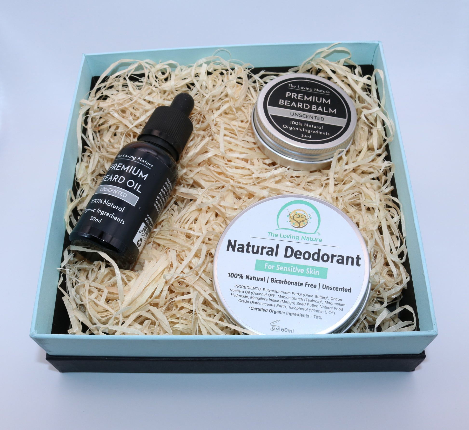 The Loving Nature - Men's Gift Set. This makes the perfect gift for a loved one to condition, style and control his beard or moustache. It also aids in happy underarms. Packaged in a striking black and turquoise premium box.